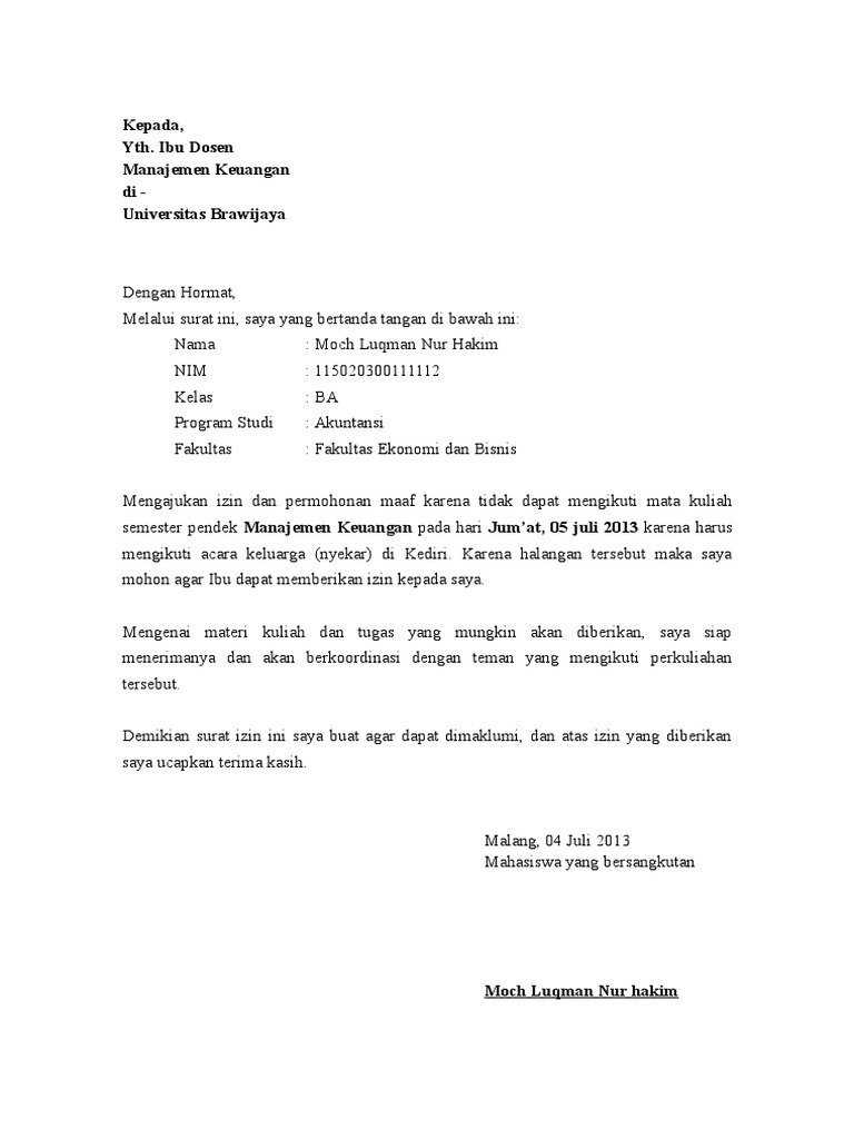 Dengan bekerja, kita akan dapat dengan mudah untuk memenuhi. Berikut ini cara menulis surat izin dan juga contoh surat izin tidak masuk sekolah, tidak masuk kuliah, tidak masuk kerja, surat izin dari orang tua dll. Karena bila tidak bisa dianggap bolos kerja dan tidak menutup kemungkinan bahwa karyawan tersebut akan mendapat surat peringatan dari berbeda dengan surat izin untuk anak sekolah, surat izin tidak masuk kerja ditulis dengan lebih formal. Jika anda sakit dan membutuhkan waktu untuk istirahat, tidak ada salahnya untuk menuliskan durasi izinapalagi jika didukung dengan surat keterangan sakit dari hormat saya. Salah satunya adalah membuat surat izin jika ingin tidak masuk kerja. Contoh surat izin yang pertama adalah sebuah surat yang anda buat karena anda sedang sakit. 2.2 contoh surat izin sekolah karena urusan keluarga. Disebut surat pribadi karena ditulis perseorangan dan dinas karena ditujukan untuk instansi tertentu. Surat izin kerja dibuat oleh pegawai untuk diberikan pada atasan atau hrd dengan tujuan meminta izin karena berhalangan masuk kerja. Jadi, pada dasarnya, ada dua hal yang perlu digarisbawahi. Contoh surat izin tidak masuk kerja. Contoh surat izin tidak masuk kerja. Permohonan izin ini saya ajukan karena sesuai dengan hasil pemeriksaan yang tertera pada surat keterangan dokter (saya lampirkan), saya.